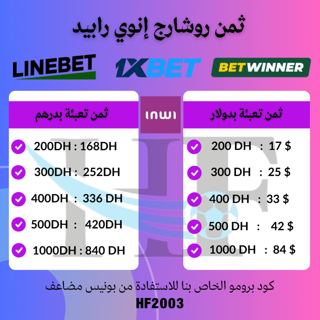 إشحن حسابك عن طريق إنوي لشحن حسابك عن طريق تعبئة إنوي السريعة يجب الضغط على الواتساب في الأسفل لتكلم مع الوكيل لشحن حسابك بتعبئة إنوي لشحن حسابك اضغط هنا اكتشف مجموعتنا على تطبيق تلغرام من أجل الاستفادة من الرمز الترويجي الخاص بنا و أيضا الرهاناة التي نقوم بمشاركتها مع الأعضاء مجموعة تلغرام اضغط هنا × عذرا ! مواقيت عمل طاقمنا التقني يبدأ من الساعة 9 صباحا حتى 1 بعد منتصف الليل، شكرا على تفهمكم. × الرجاء الانتظار! سوف يتم تحويلكم لتطبيق واتساب من أجل إتمام طلبكم PrécédentSuivant