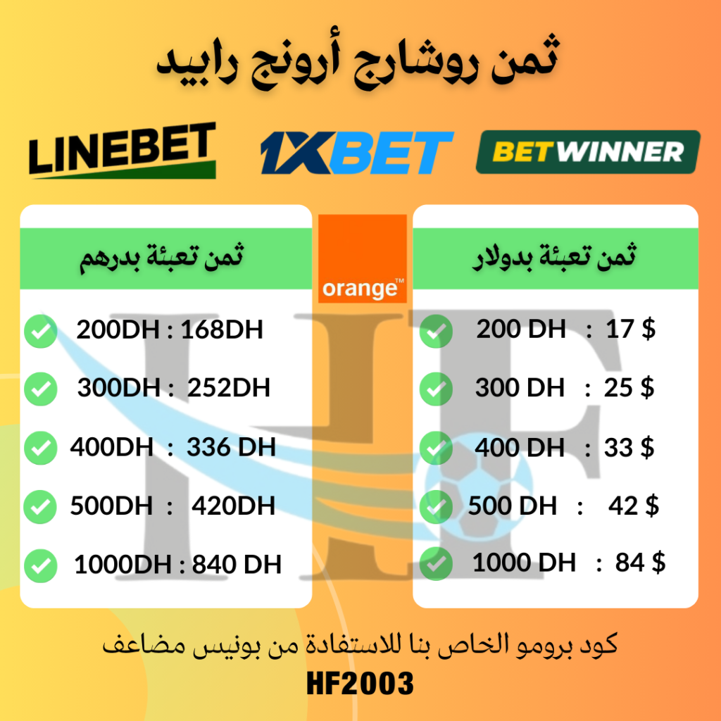 إشحن حسابك بواسطة تعبئة أورونج لشحن حسابك عن طريق تعبئة اورونج السريعة يجب الضغط على الواتساب في الأسفل لتكلم مع الوكيل لشحن حسابك بتعبئة اورونج لشحن حسابك اضغط هنا اكتشف مجموعتنا على تطبيق تلغرام من أجل الاستفادة من الرمز الترويجي الخاص بنا و أيضا الرهاناة التي نقوم بمشاركتها مع الأعضاء مجموعة تلغرام اضغط هنا × عذرا ! مواقيت عمل طاقمنا التقني يبدأ من الساعة 9 صباحا حتى 1 بعد منتصف الليل، شكرا على تفهمكم. PrécédentSuivant